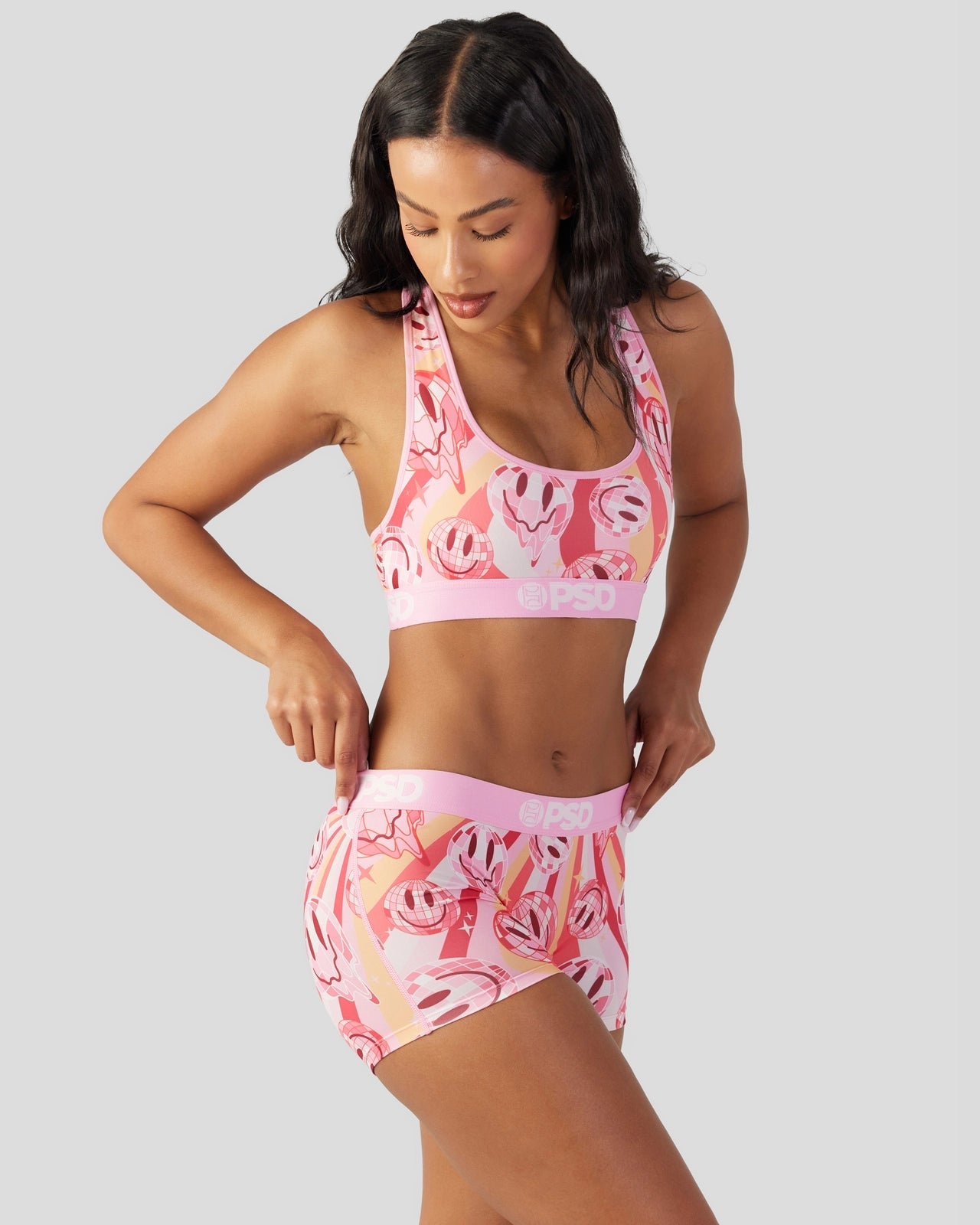 The ’70s are back with this retro new look for women. Featuring smiley-faced disco balls and a vintage-inspired striped pattern. the ’70s Smiley Sports Bra is made from a silky poly blend with a comfortable full coverage. keep-you-in fit. The PSD boy shorts are perfect for everyday wear and working out.