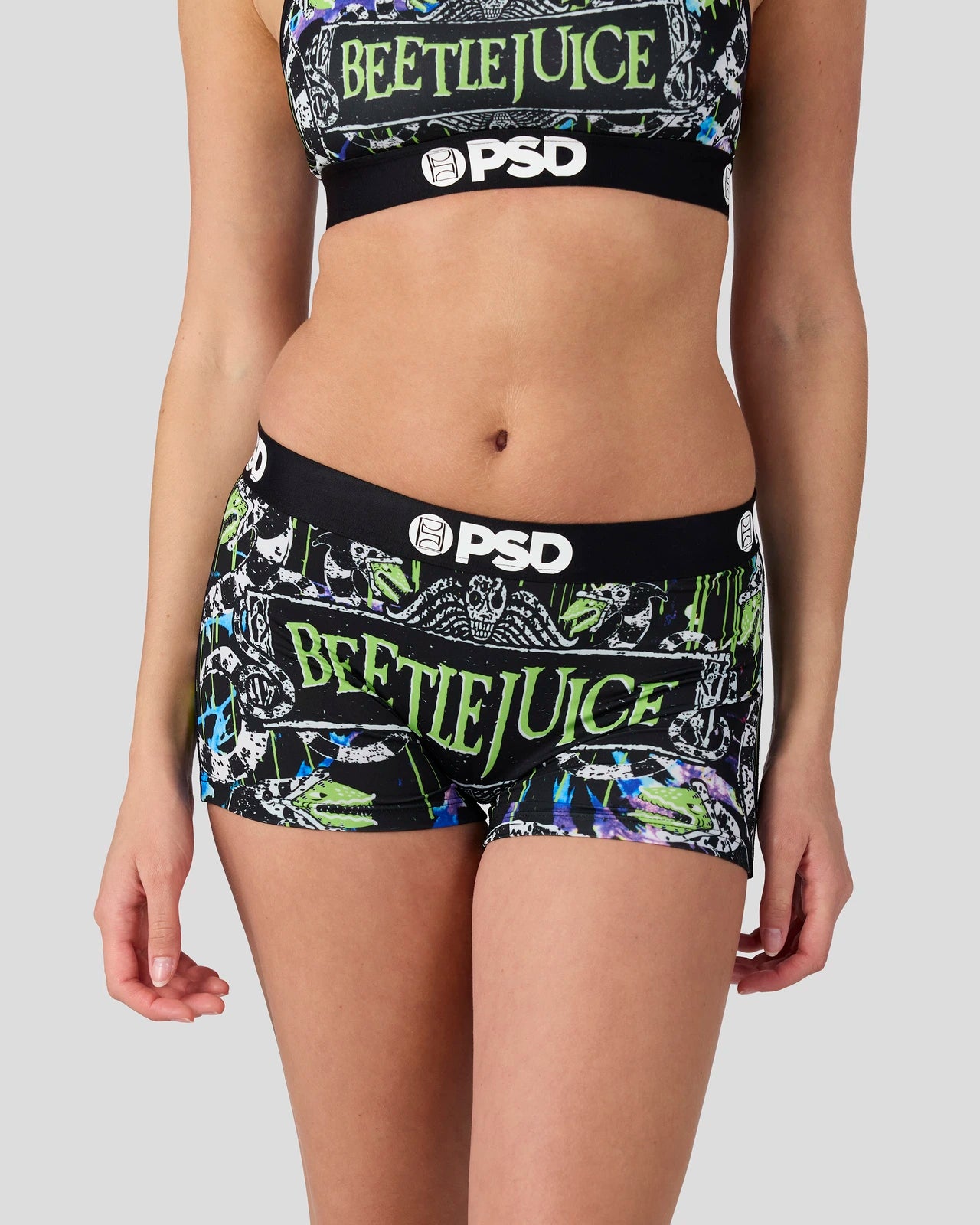 From Beetlejuice x PSD and featuring the iconic sandworm from the movie. this pair brings desert terror to your top drawer. The Sandworms Boy Short is made from a silky poly blend with a comfortable full coverage. keep-you-in fit. The PSD boy shorts are perfect for everyday wear and working out.