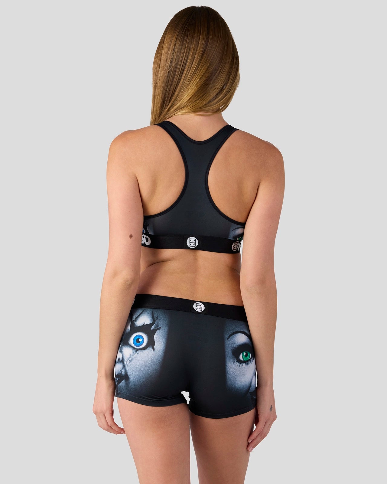 Double the terror. double the stitches. This style from Chucky x PSD features everyone’s favorite chaotic couple. The Bride of Chucky Boy Short is made from a silky poly blend with a comfortable full-coverage. keep-you-in fit. The PSD boy shorts are perfect for everyday wear and working out.