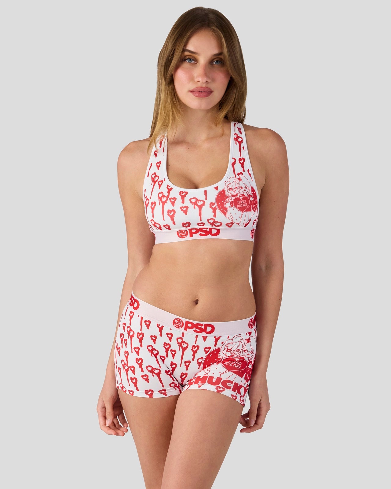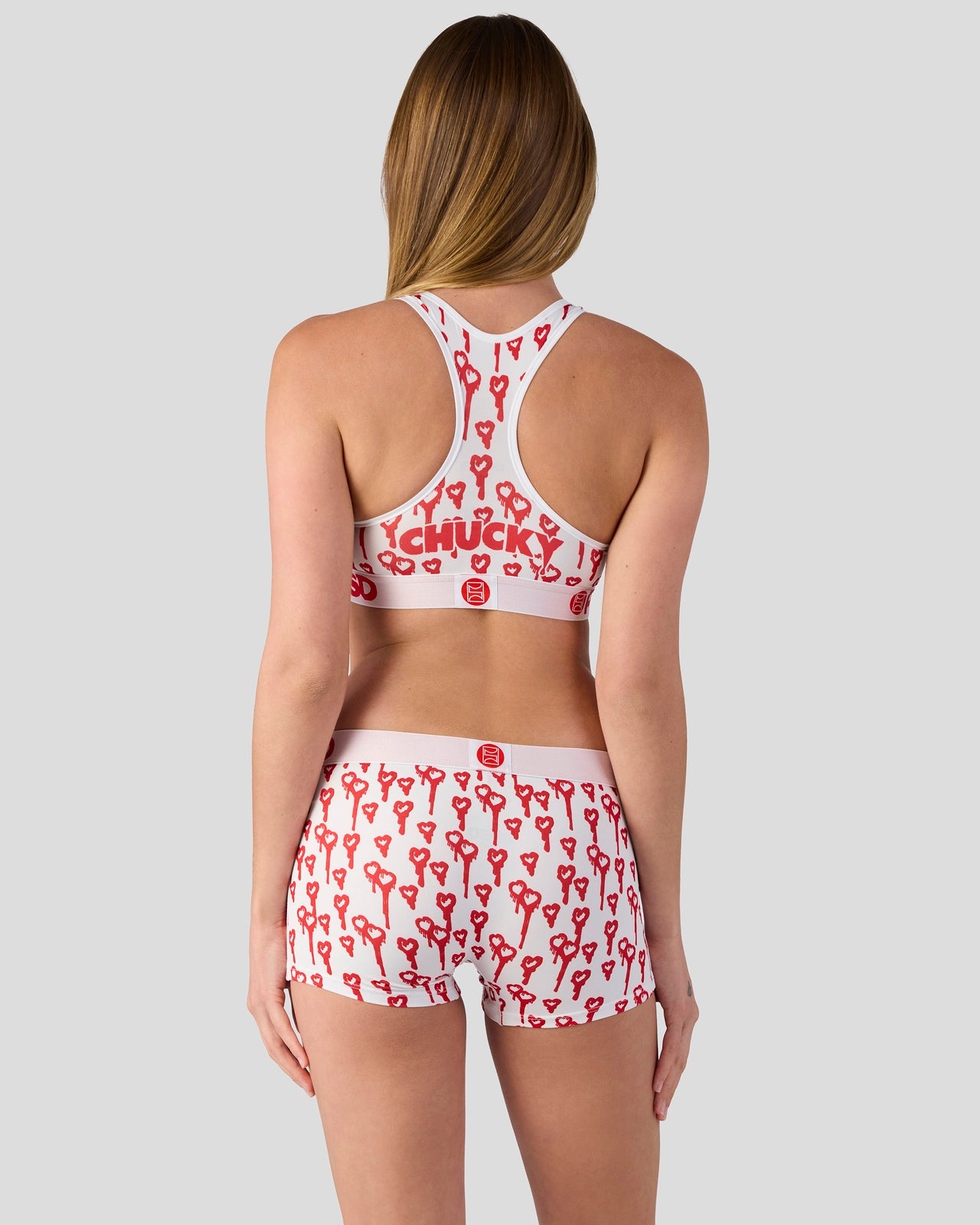 Meet the ultimate horror couple. From Chucky x PSD. this look captures their twisted slashers-in-love chemistry. The TIl Death Sports Bra is made from a silky poly blend that’s breathable yet slightly compressive. bringing you the comfort and support you need for everything you get into.