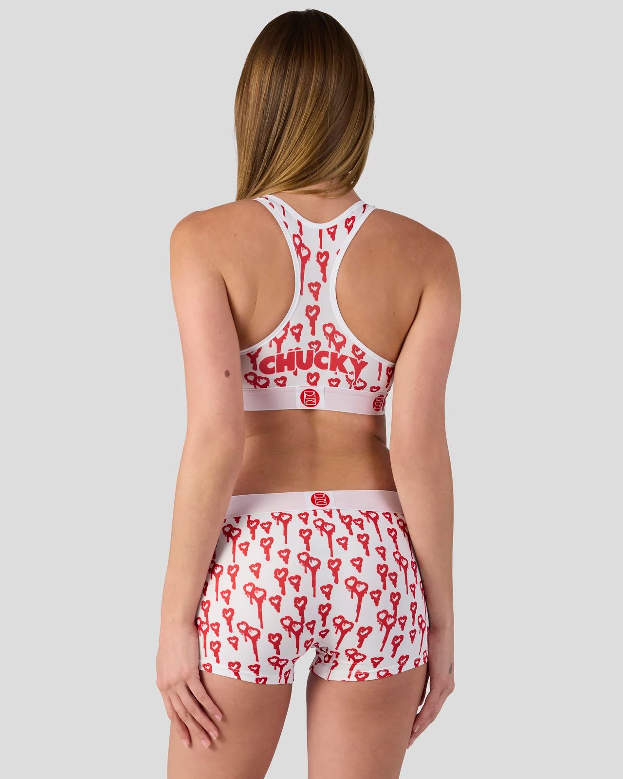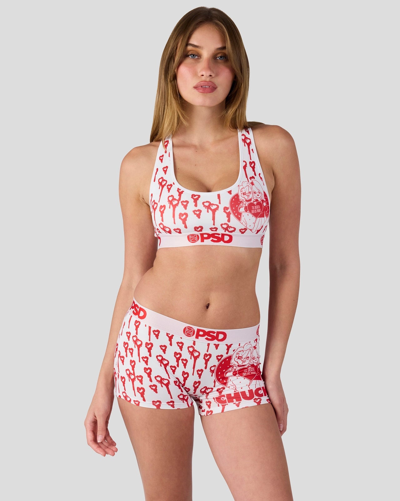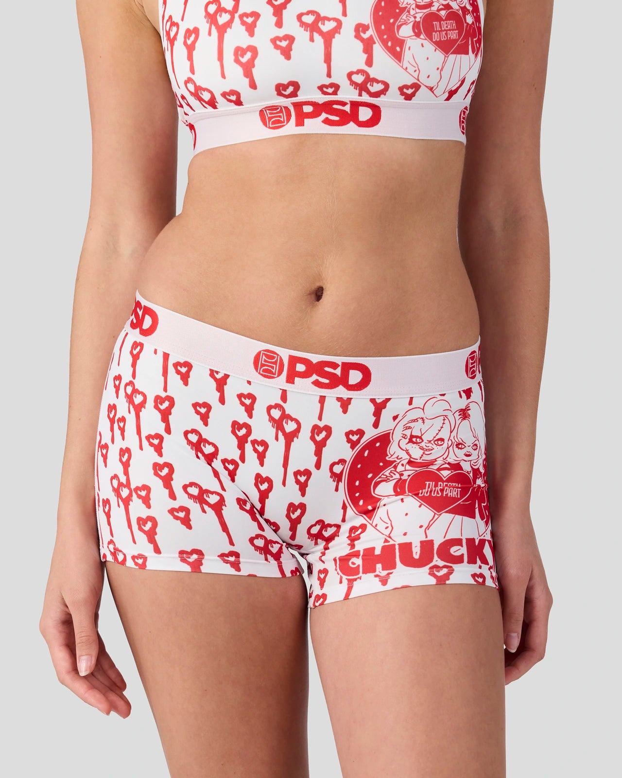 Meet the ultimate horror couple. From Chucky x PSD. this look captures their twisted slashers-in-love chemistry. The Til Death Boy Short is made from a silky poly blend with a comfortable full-coverage. keep-you-in fit. The PSD boy shorts are perfect for everyday wear and working out.