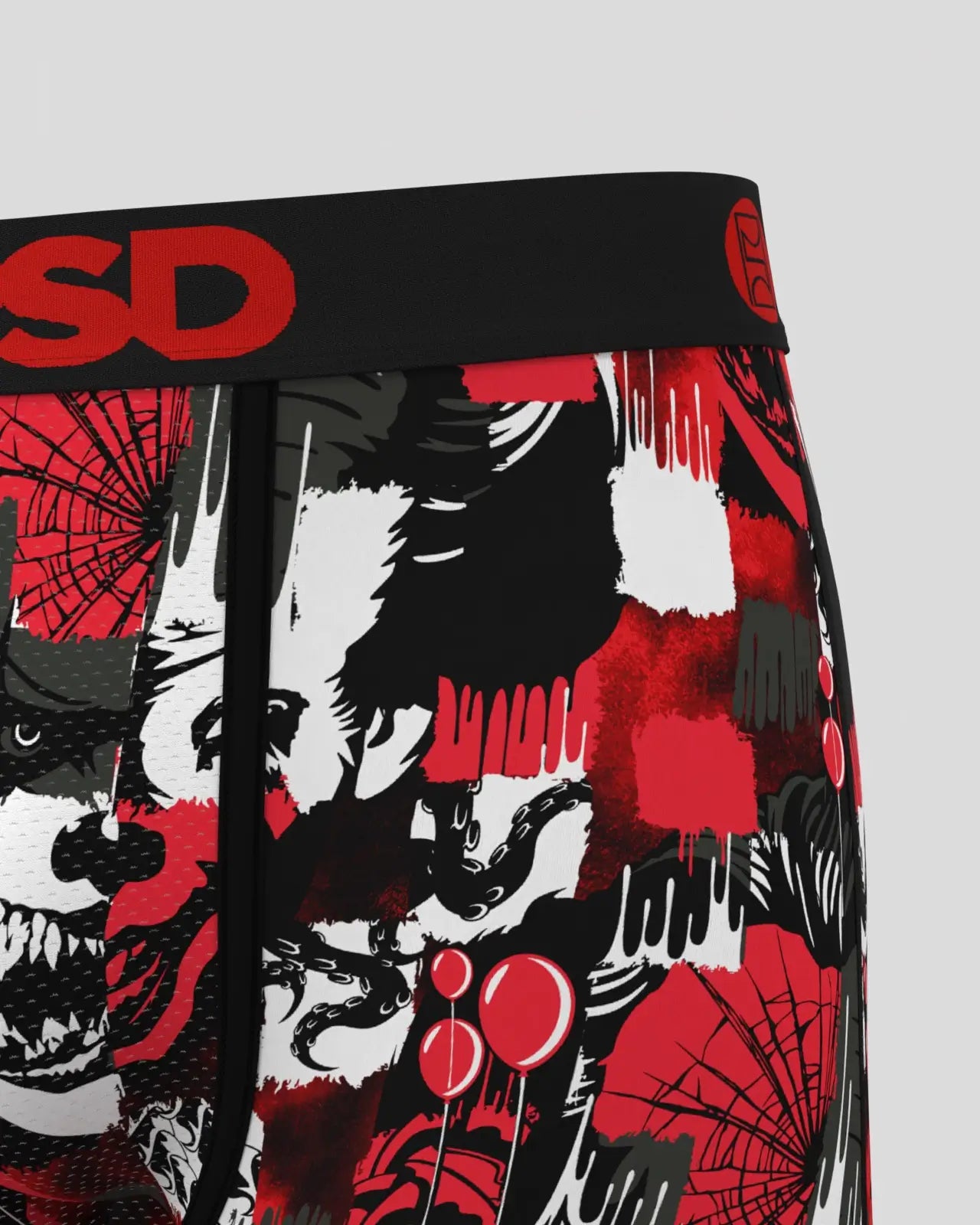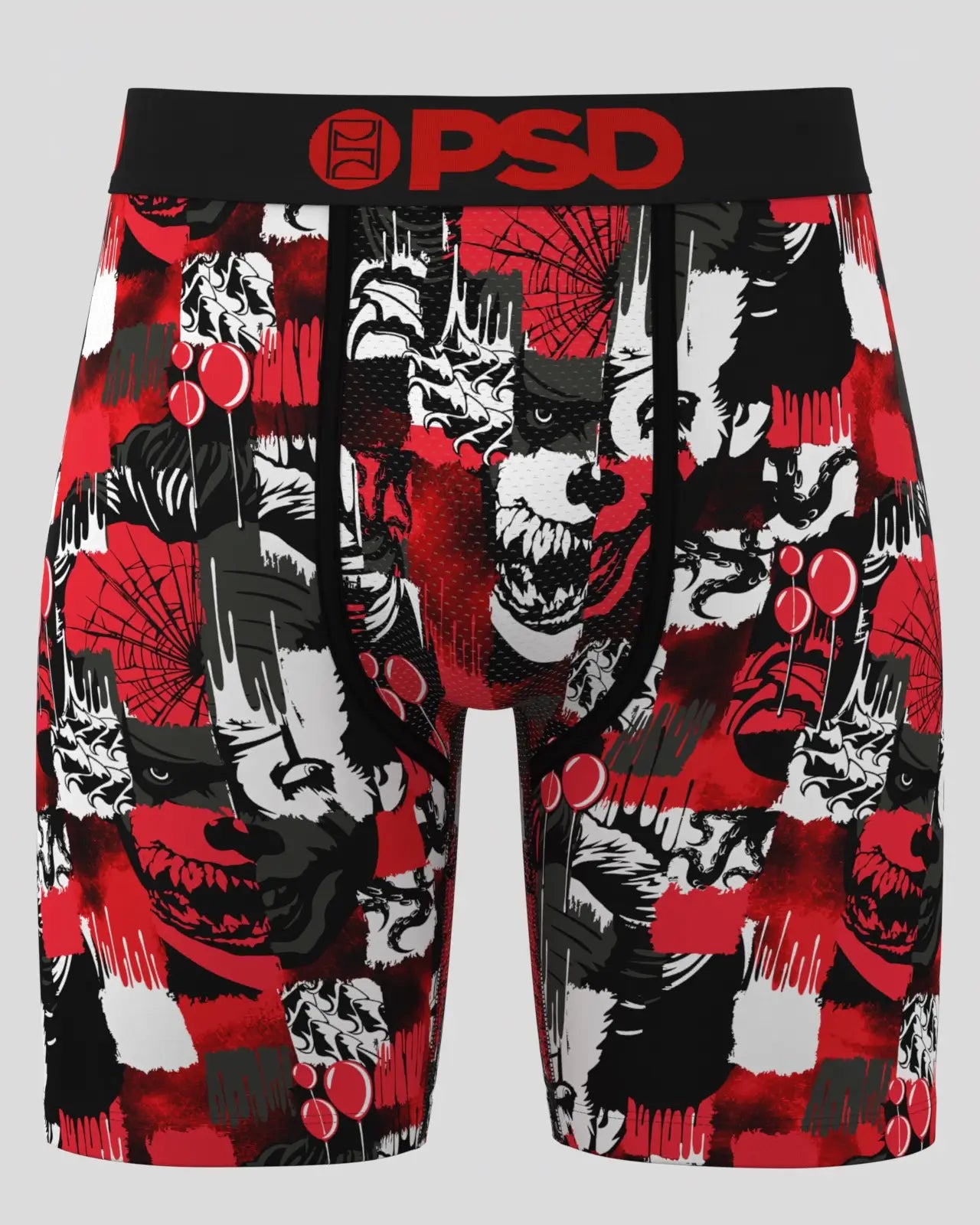 Welcome back to Derry in this terrifying new drop from It x PSD. Featuring the menacing face of Pennywise and his infamous red balloon. the Checkers briefs include our ultra-comfortable Signature WaistBand. a breathable MicroMesh pouch. and four-way stretch. The PSD 7 Standard Length Briefs won’t roll or ride and were built for everything. from everyday wear to your toughest workouts.