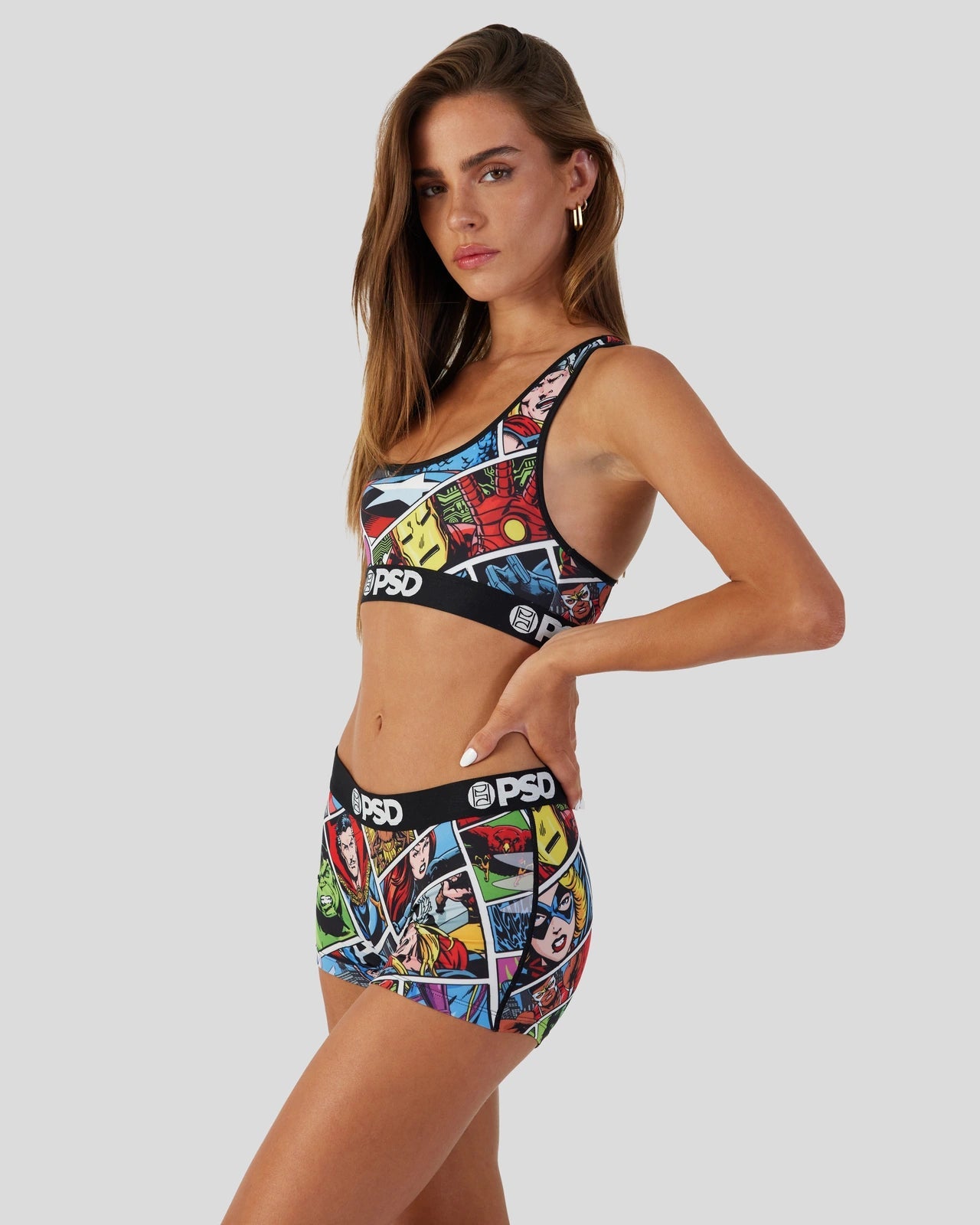 Featuring a retro comic strip. this Marvel Comics Underwear design includes beloved characters from the books like Dr. Strange. the Incredible Hulk. and Ant-Man. Made with our silky poly blend. the Boy Short is breathable yet slightly compressive. bringing you the comfort and support you need for everything you get into.
