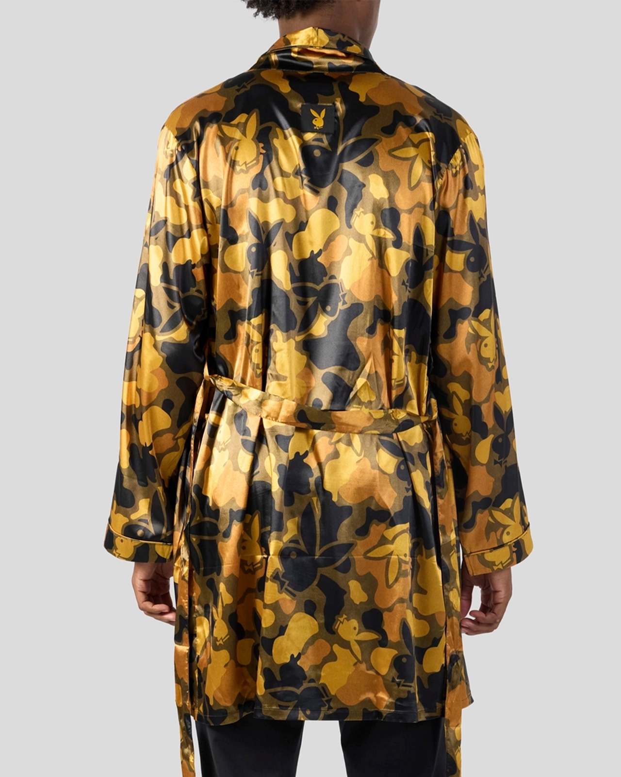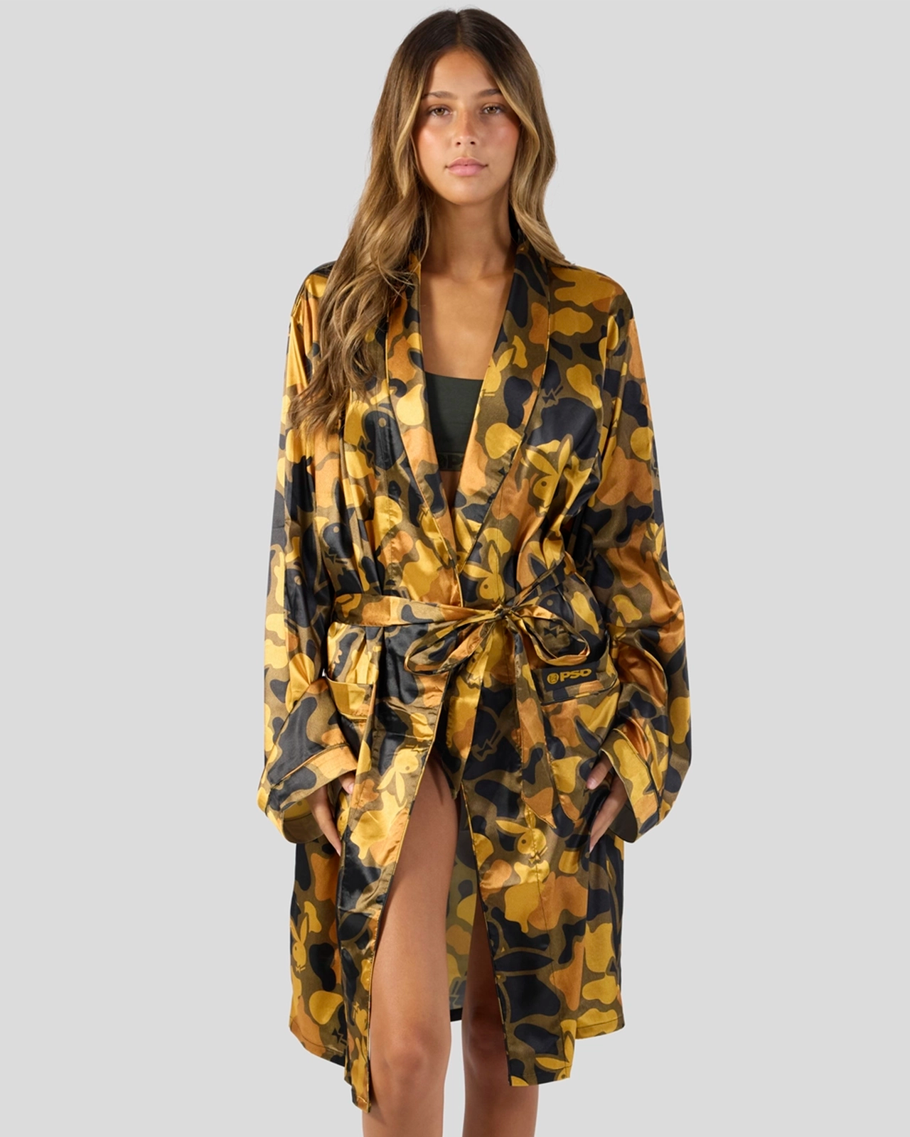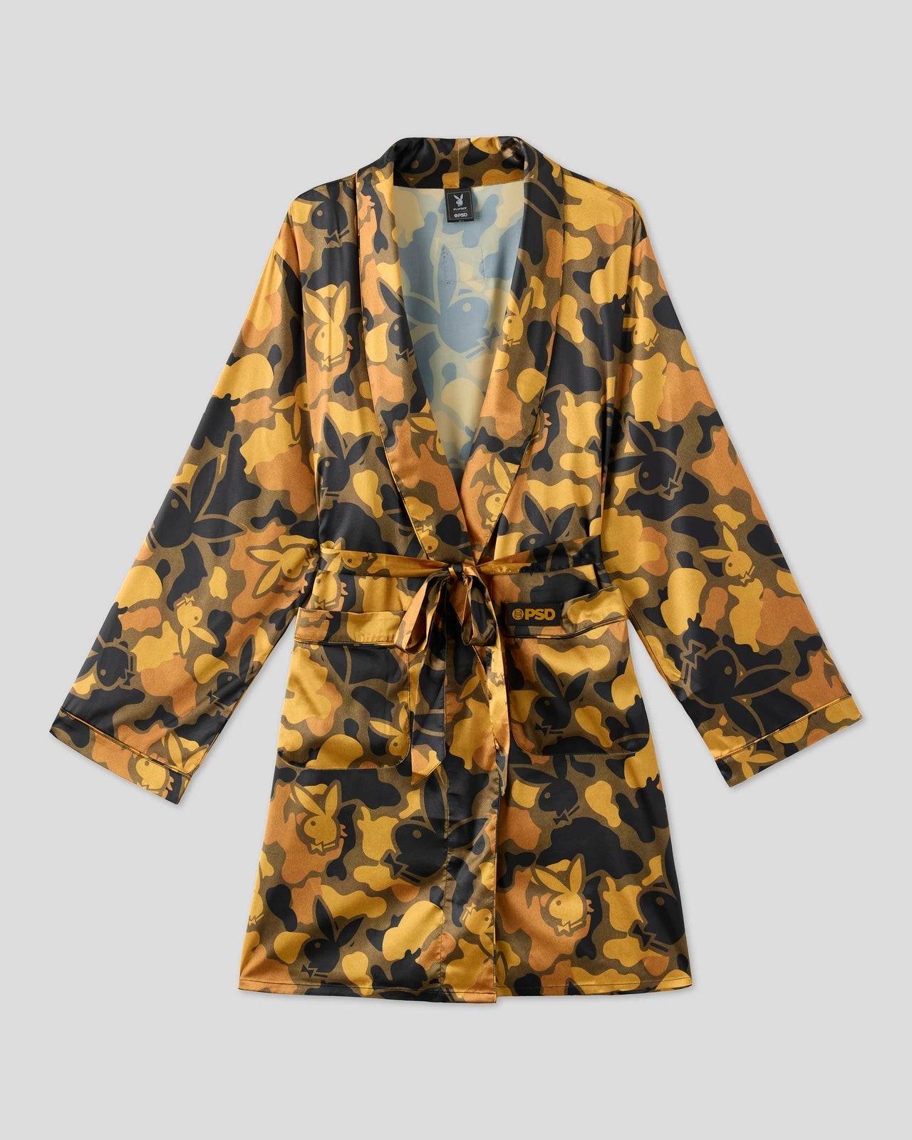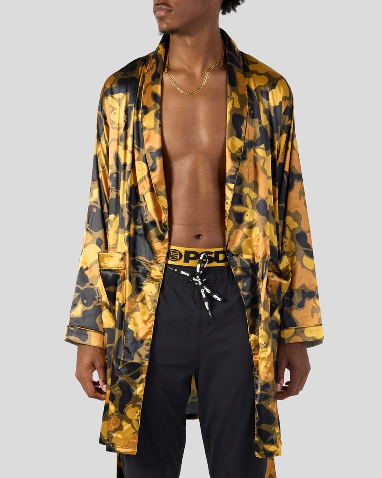 Lounge in luxury with the unisex Silk Gold Robe from Playboy x PSD. Made of a satin-based. silky fabric. it features a classic silhouette with a shawl collar. adjustable or removable belt. and two front pockets.