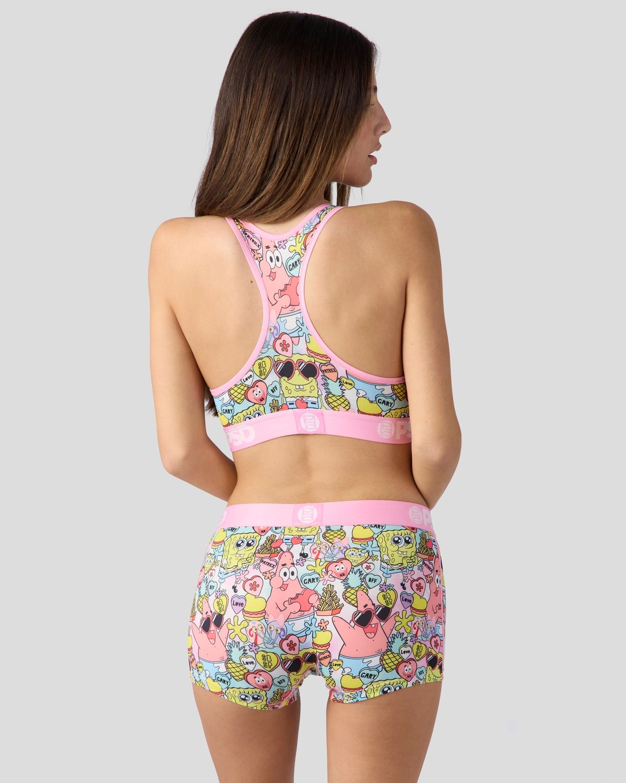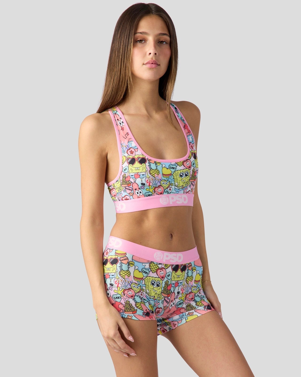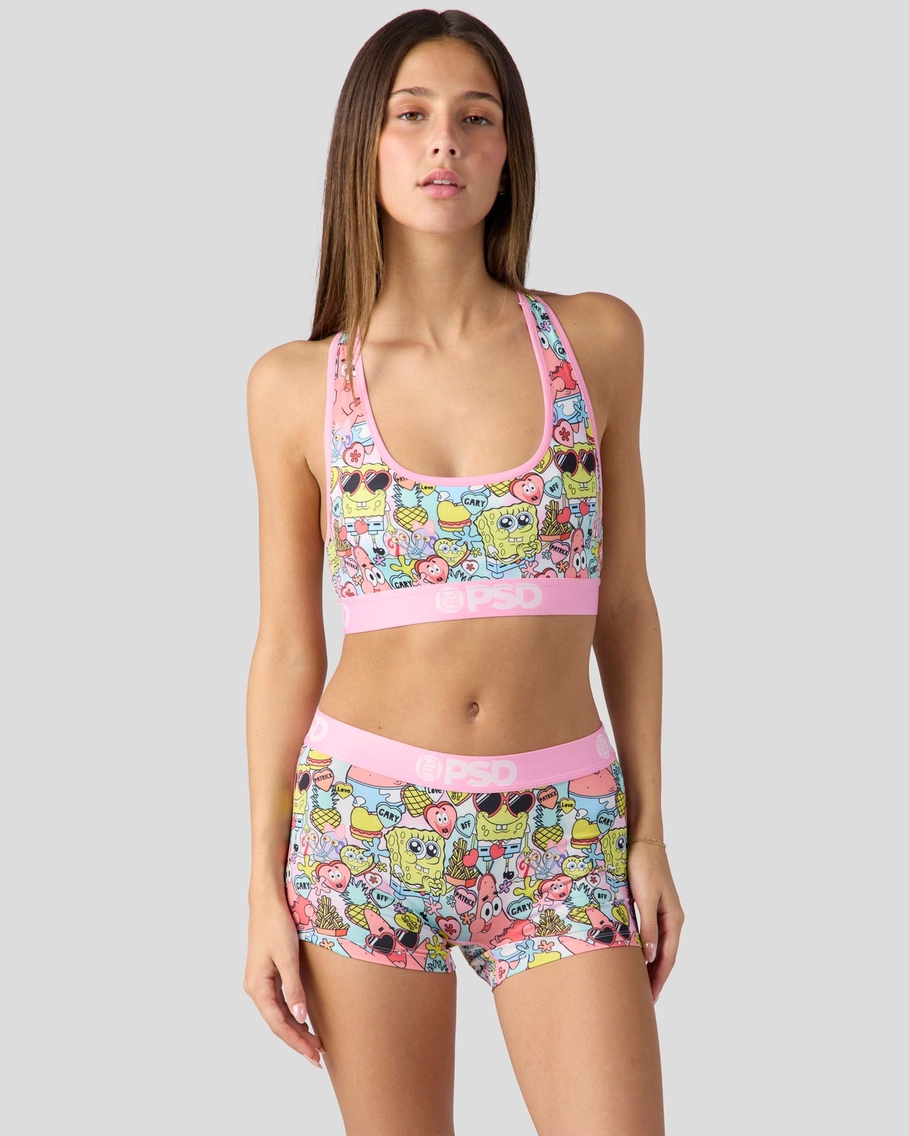 This new style from SpongeBob SquarePants x PSD is like a love letter sent all the way from Bikini Bottom. The XOXO. SpongeBob Sports Bra is made from a silky poly blend and is breathable yet slightly compressive. bringing you the comfort and support you need for everything you get into.